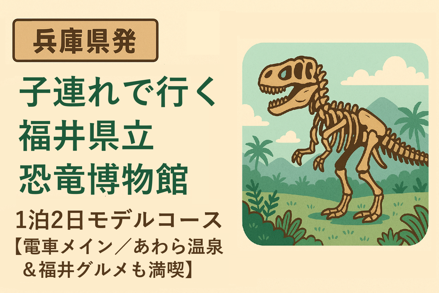 この記事では、兵庫県内(神戸・明石・姫路あたり)から福井県立恐竜博物館へ、小学生までの子ども連れファミリー向けの1泊2日モデルコースを紹介します。