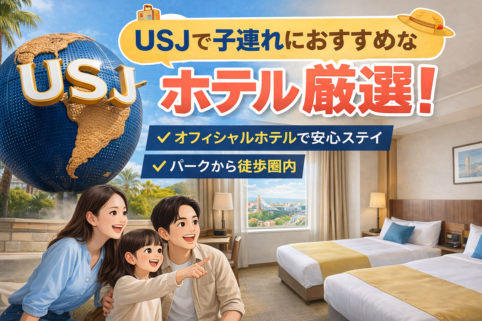 大阪・USJ旅行を計画しているとき、必ずといっていいほど迷うのが「どのオフィシャルホテルに泊まるか?」ではないでしょうか。特に小さなお子さま連れのファミリーなら、アクセスのしやすさやお風呂、客室の広さ、添い寝対応など、気になるポイントがたくさんありますよね。