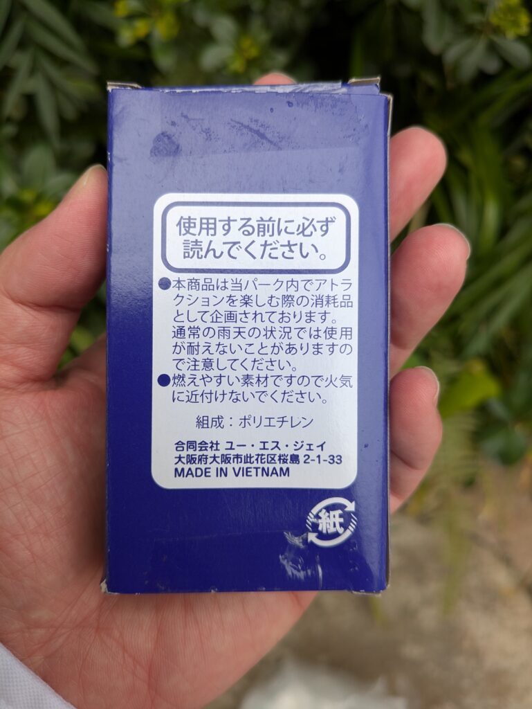 ●本商品は当パーク内でアトラクションを楽しむ際の消耗品として企画されています。通常の雨天の状況では使用が絶えないことがありますので注意してください。