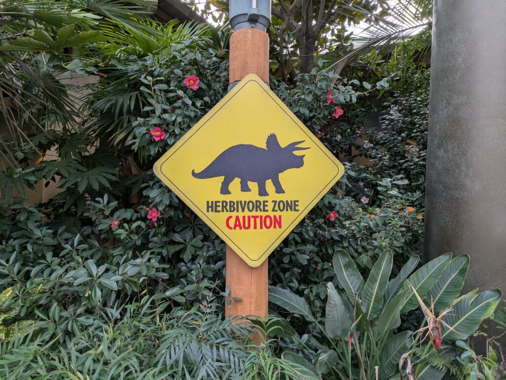 「Herbivore area caution」 つまり「草食恐竜エリア 注意」ですね!
