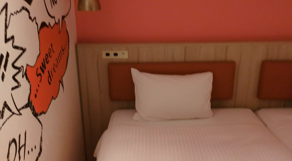 ベッドは2台、枕もそれぞれ1つ。コンセントはベッド横に1つずつ。