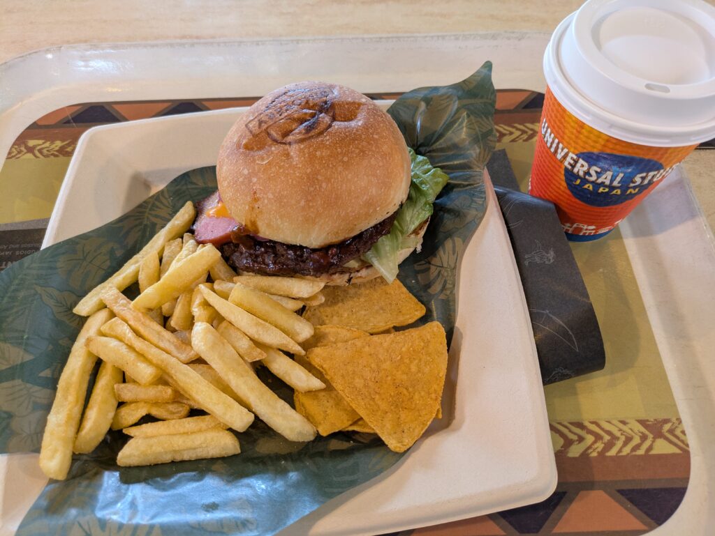 注文したのは「ラプトルのバーガーセット」とホットコーヒー。 提供時、店員さんが「おいしい肉食恐竜一体お持ちします!」とユーモアたっぷりに声をかけてくれ、思わずクスッとしてしまいました。