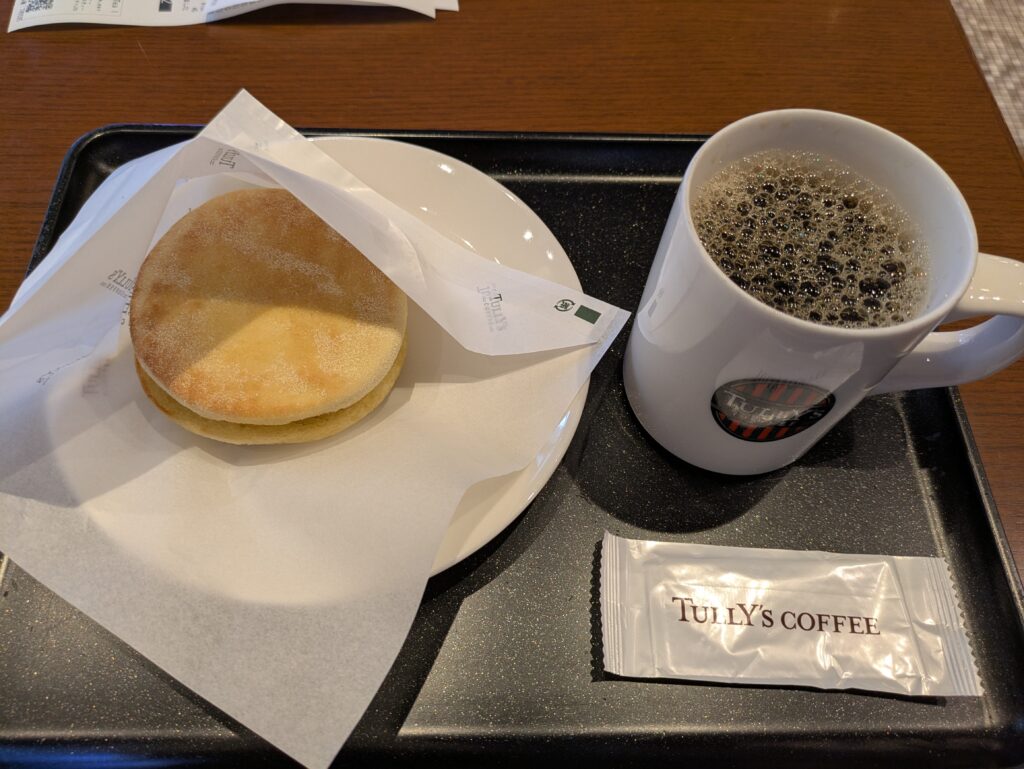 翌朝は6時に起床。オフィシャルホテルは11時チェックアウトなので、朝の時間をとてもゆったり過ごせます。 8時頃にホテルの目の前にある「タリーズコーヒー」へ向かい、イングリッシュマフィンツナチーズとホットコーヒーのSサイズ(セットで700円)で朝食をとりました。