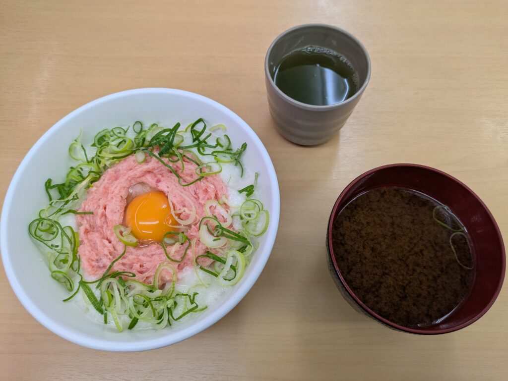 ネギトロに卵ととろろが乗った丼(1,400円)を注文しました。港町に来ると無性に海鮮が食べたくなりますよね。店内に流れる懐メロのエモいBGMも相まって、疲れが吹き飛ぶ美味しさでした。